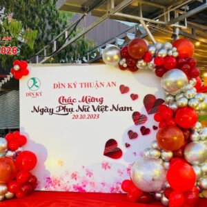 Backdop là khu vực chụp hình, là nơi mà chúng ta sẽ thấy đầu tiên và ghi dấu hình ảnh với tấm backdrop này. Backdrop chủ đề ngày 20/10 là mẫu backdrop chuyên về cho ngày lễ này, thường sẽ trang trí kèm theo các đồ trang trí như hoa, bóng, cây lá,… Thông tin trên backdrop có nội dung tôn vinh vẻ đẹp của người Phụ Nữ.