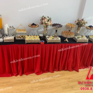 - Nước uống: café Trung Nguyên + sữa đặt , nước trái cây , trà lipton Dùng ly giấy, đĩa sứ, muỗng nĩa inox, hoa và kệ trang trí cơ bản.
