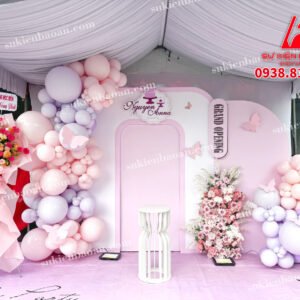 Chúng tôi chọn trang trí trên backdrop tone màu nhẹ nhàng, thư thái. Như hồng pastel, tím nhạt, xanh lá cây, kết hợp với màu trắng hoặc vàng nhạt để tạo điểm nhấn.