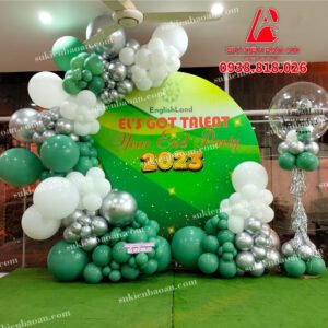 - Kết hợp Trang trí bóng backdrop màu xanh lá – bạc- trắng